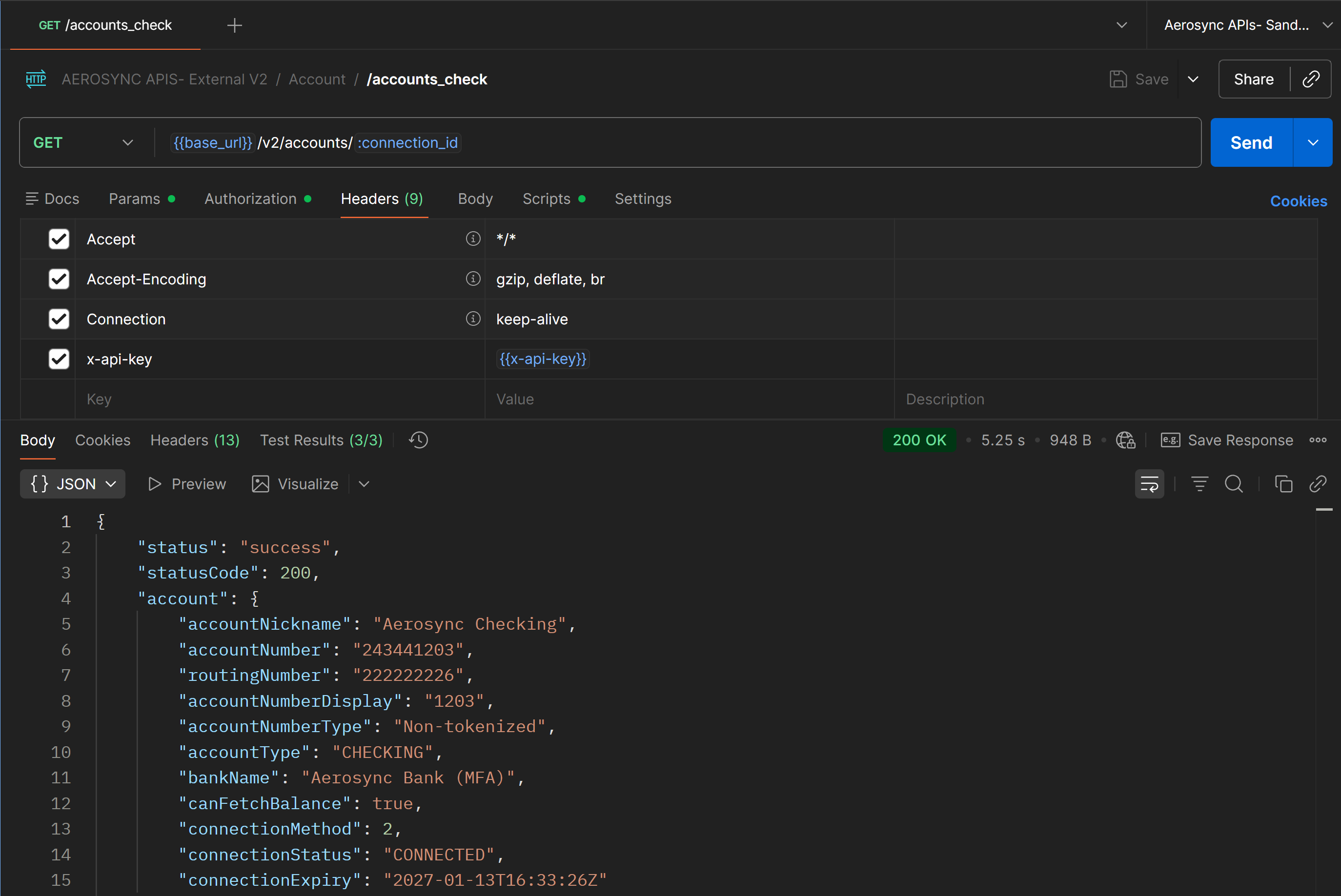 To begin testing the Aeropay APIs, you'll need to generate a connection_id and modify it in the environment variable. The connection_id is a unique identifier for a bank connection that will be used to fetch data for that bank. This connection_id is returned from the Aerosync widget after a user successfully links a bank.