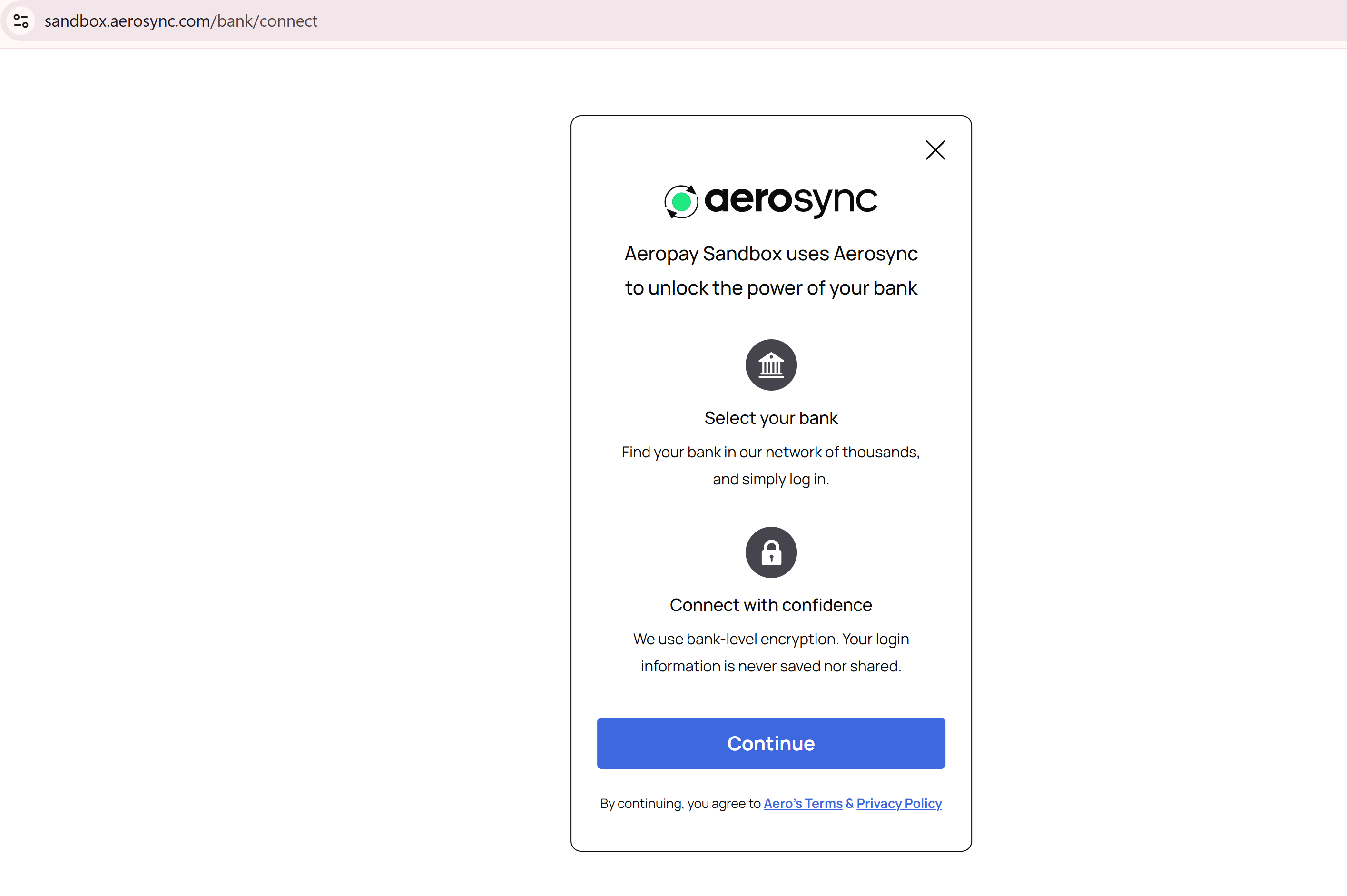 If you're interested in diving into testing the Aerosync APIs before you've built a working bank connection widget, the following steps will walk you through how to retrieve a connection_id value to begin testing.