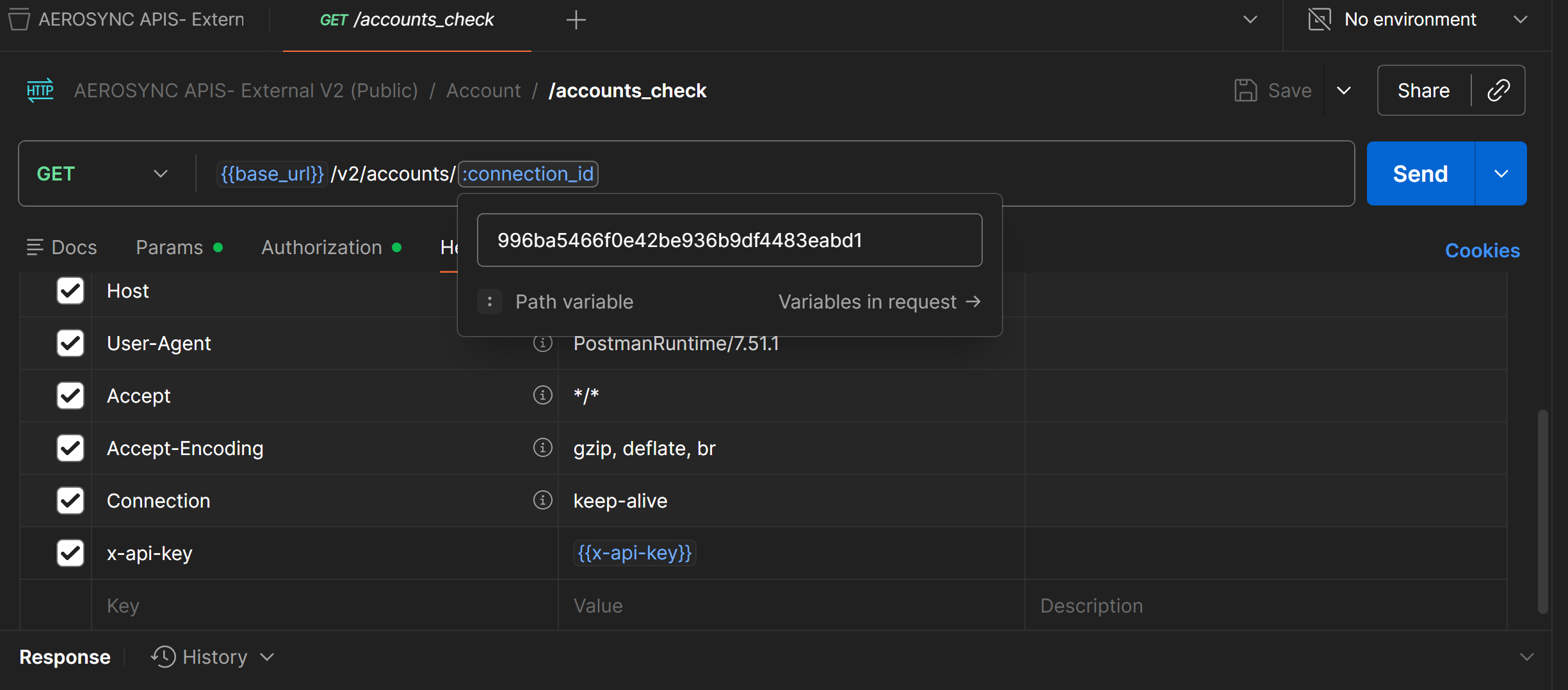 Step 1: Go to Collection, open any API to test and add the connection_id from the previous pre-conditions step.